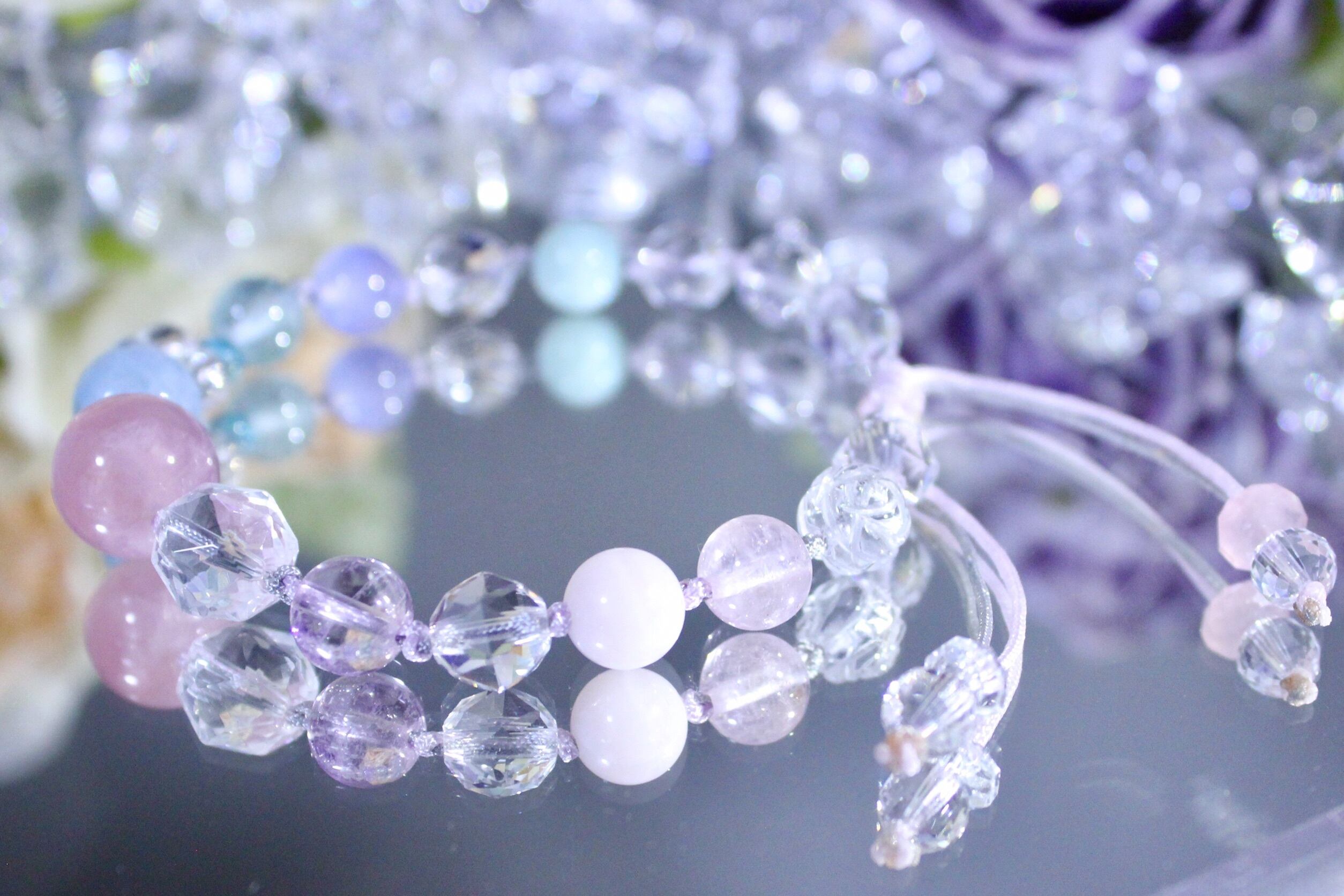 ディープローズクォーツの深みのある上品なピンクと、アクアマリンの澄んだブルーの色合いがとても綺麗なブレスレットです♡