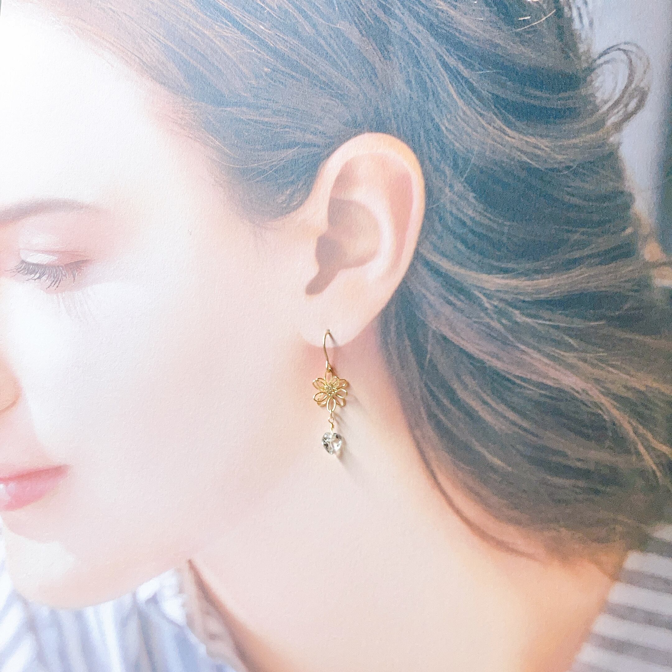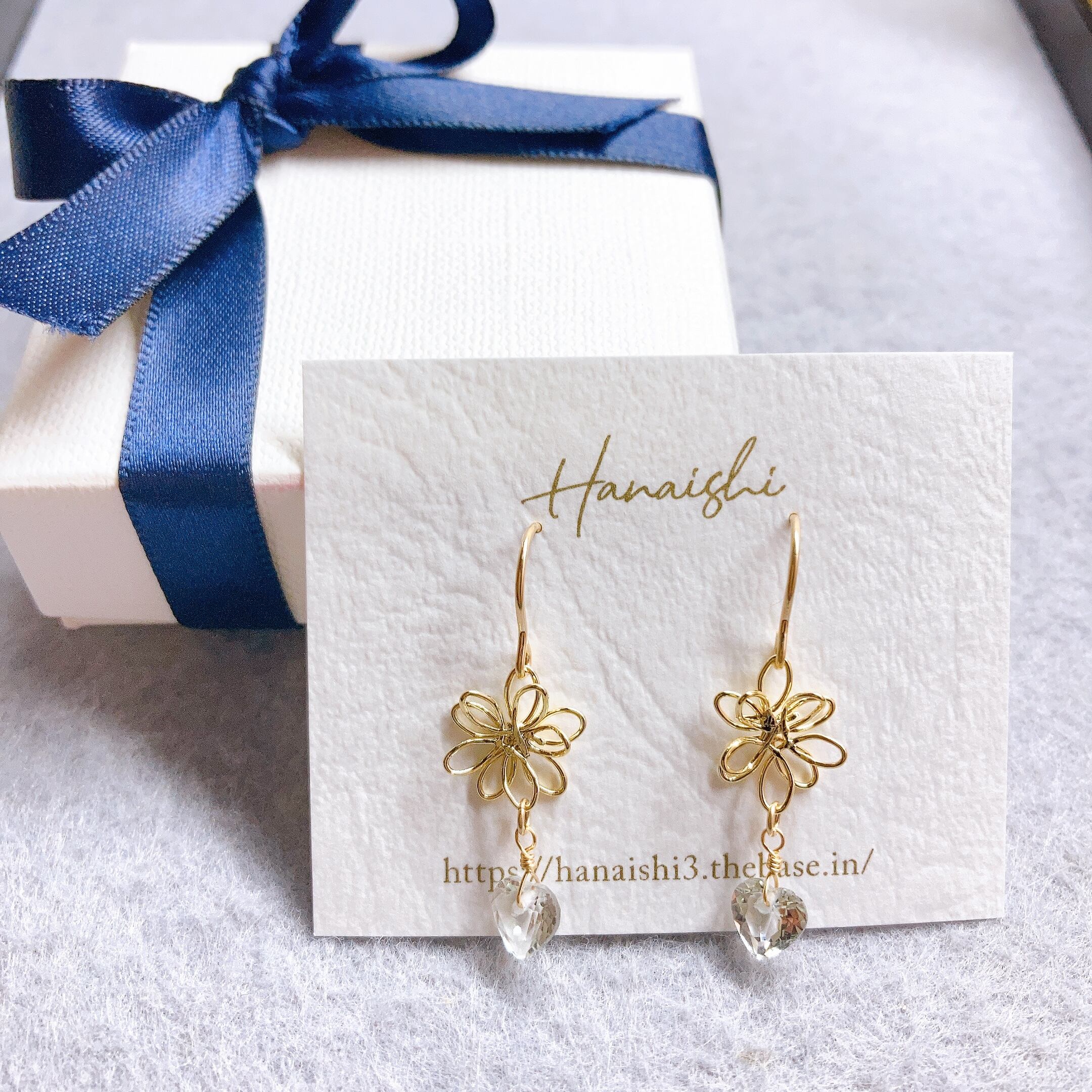 ハートカットのプラシオライト(グリーンド・アメシスト)がさりげなく揺れる可愛らしいピアスです。